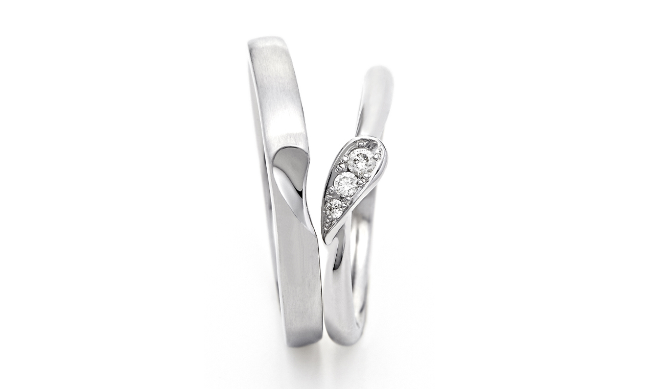 ふたりだけが知っている“隠れハート”をデザインしたロマンティックな指輪。結婚指輪のV字ラインを少し傾けることで、正面にハートが現れるデザインです。