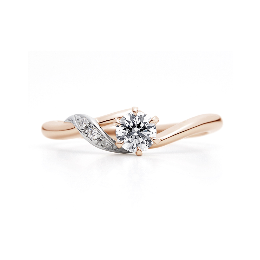 婚約指輪:センターダイヤモンドは6本爪です。センターダイヤモンドの左側にはメレダイヤモンド(0.01ct×1,0.005ct×2)のパーツを留めています。空間を作り、側面までくるんとウェーブをかけたパーツが指をすっきり見せ、エレガントな印象になるよう造り込みました。